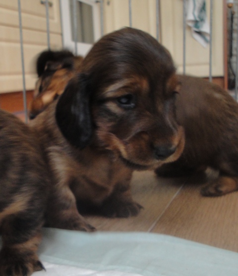 03.06.2014 16:23Dnes jsem si dala víc práce s focením našich Éček, z třiceti fotek jsem získala s odřenýma ušima pár snímků které jsem přidala do jejich galerie, některé dávám sem. Mrňata jsou už velká a je s nima sranda, honí se tu, hrají si, ale také se začínají hezky prát, vrčí a štěkaj o sto šest. Také jsem je zvážiila a vypadá to takto: Elisabeth 1017g, Efram 1120g, Elza 1090g.