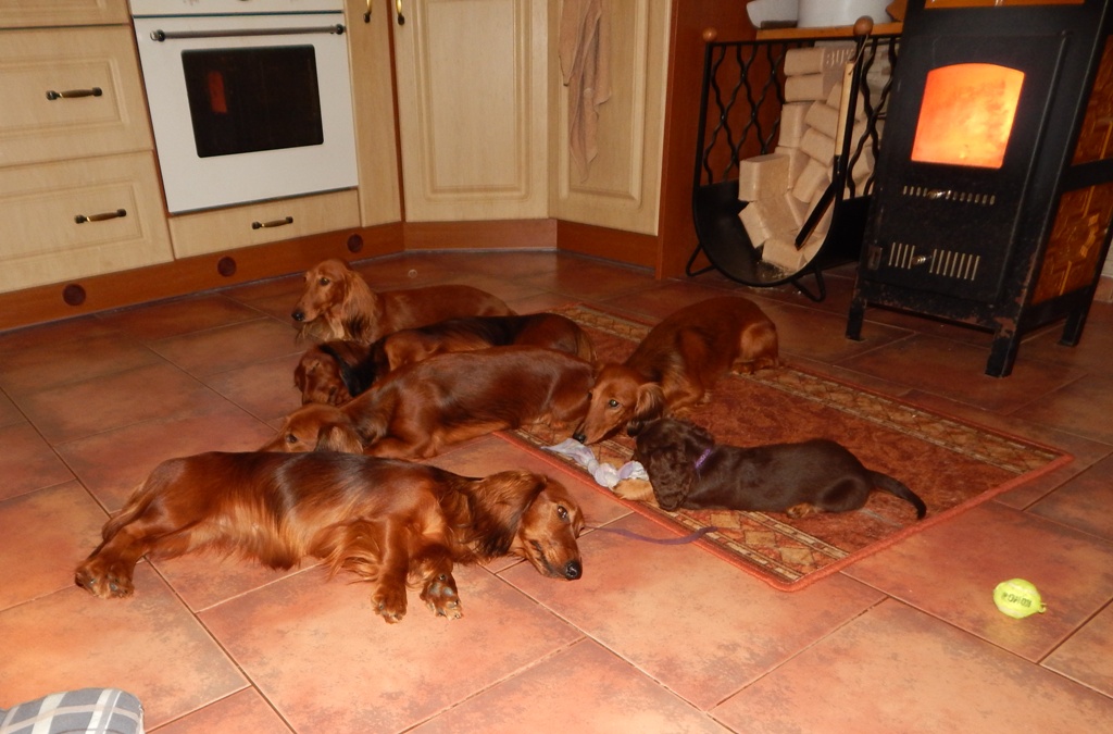 Smečka začala poměrně rychle reagovat na nového člena a v současné době si malá rošťanda pěkně omotala Elzu okolo prstu, jak se říká. Nejhezčí je ovšem ten fakt, že malá nechce spát sama v ohrádce v pelíšku ale se smečkou. Někteří jedinci jako je Orin, Anelly a Elza jsou doslova namačkáni v miniaturním pelíšku (vyměnili si to) a Chaimé si lebedí s ostatními ve velkém pelechu.Bohužel takovou fotku zatím nemám ale velmi podobnou ano, je to pelíšek Sáry v kuchyni, ta jediná má soukromí. :-) Přikládám pár fotek a nějaké dám do její galerie.