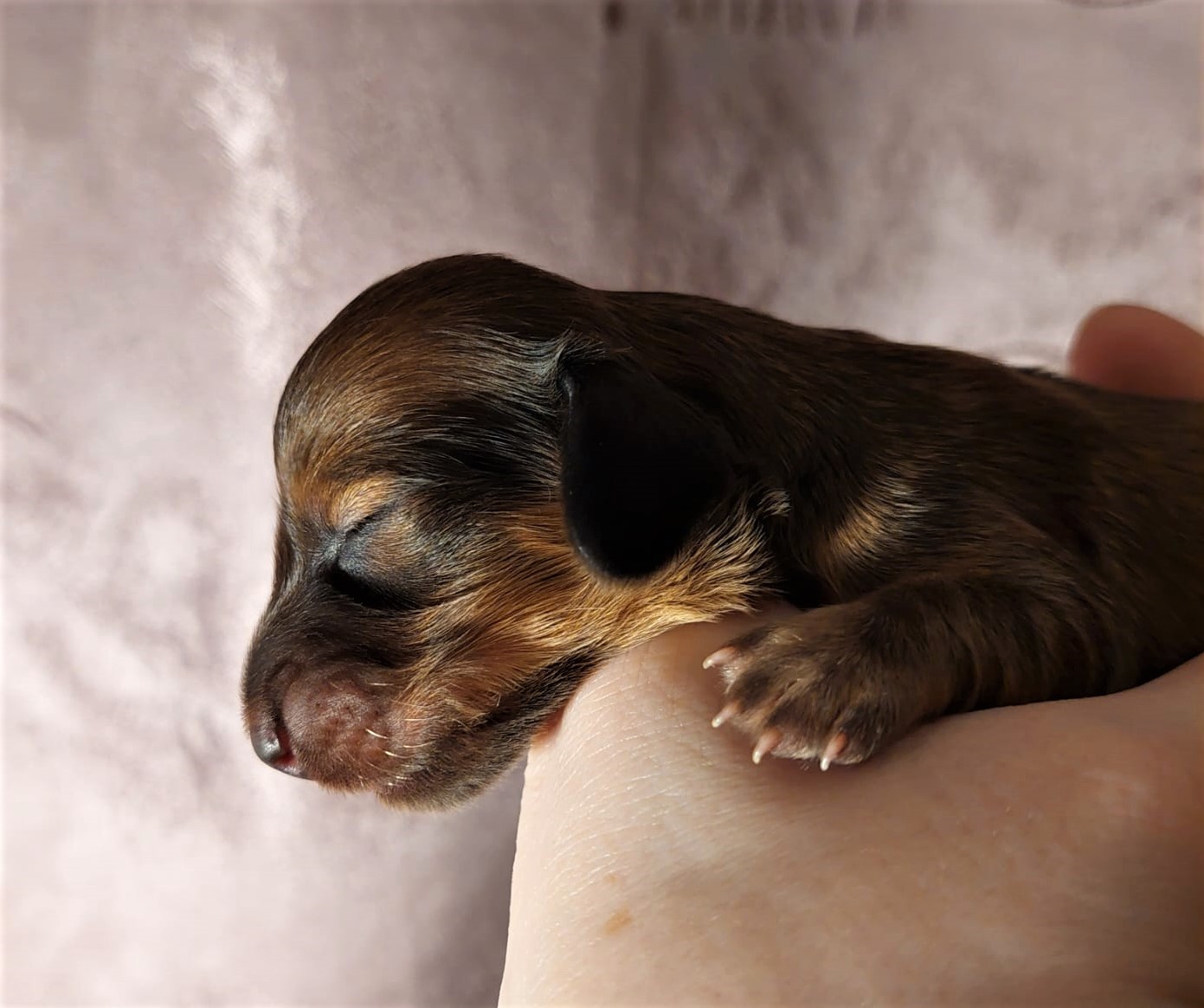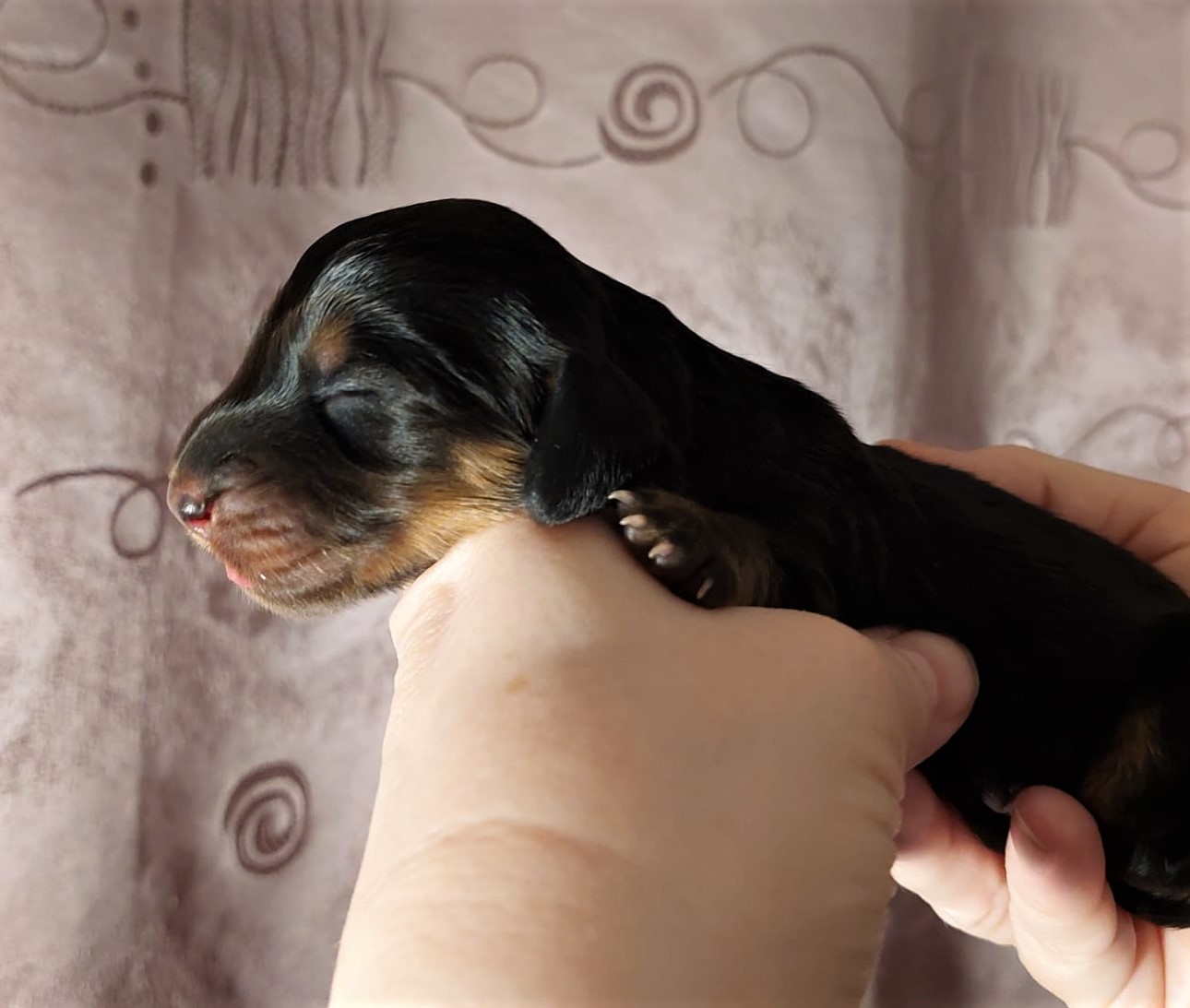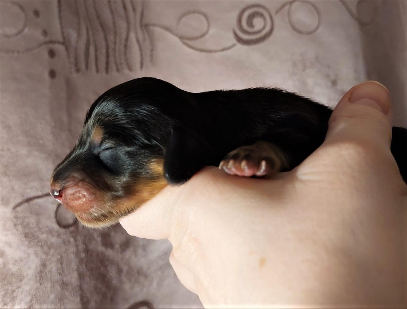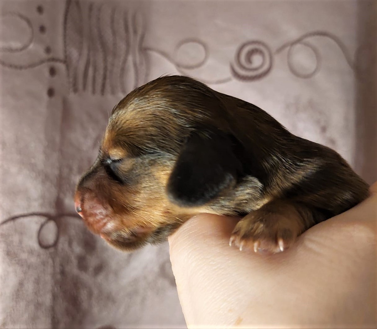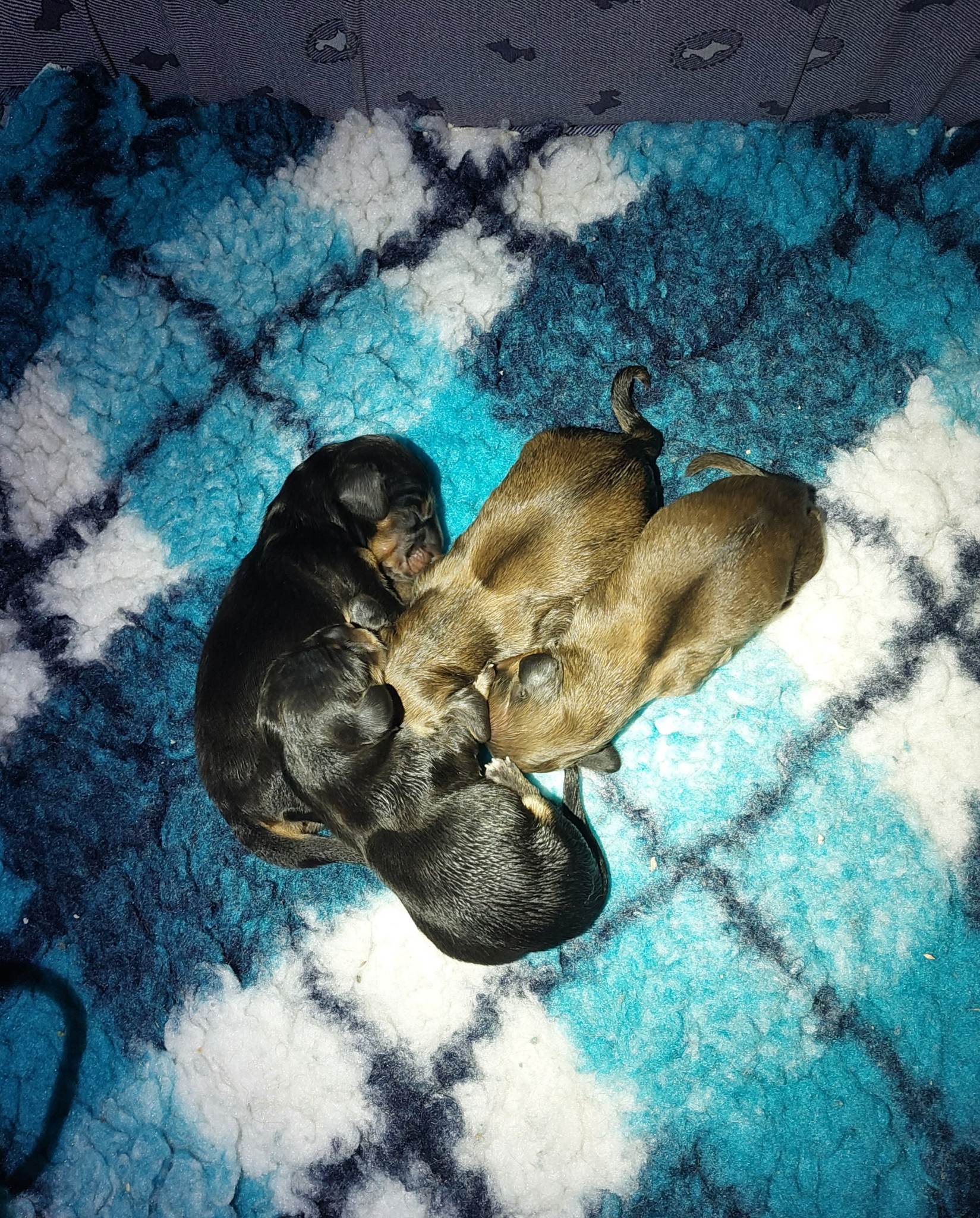Brzy ráno 3,55 hod. se narodila fenka která vážila 288g! Zbarvení nese černá s pálením. Dali jsme jí jméno Bria Briliant.