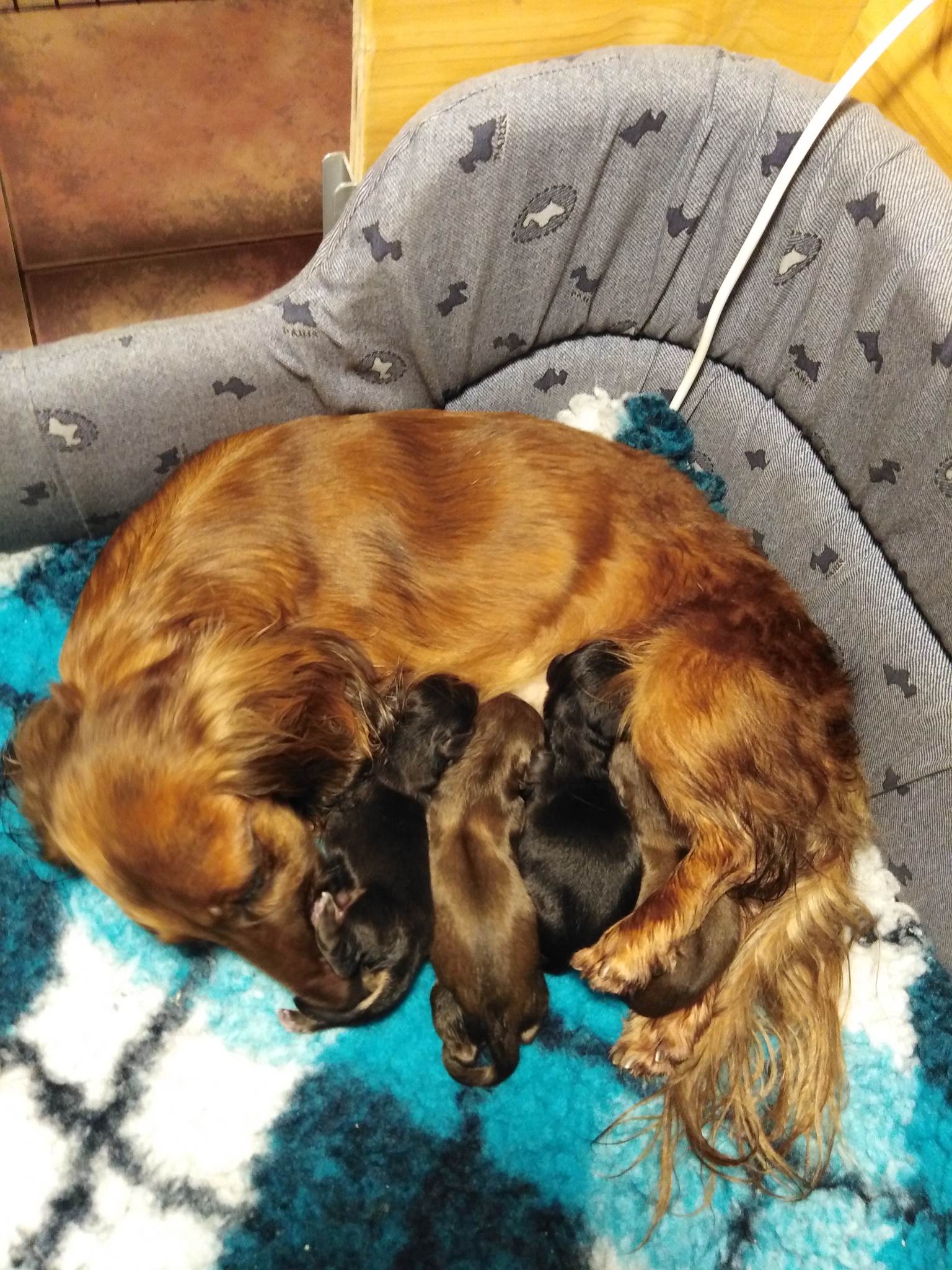 Než jsme stihli štěně zvážit, na svět přišla další fenka v čase 5,16 hod. která vážila 208g a má barvu červenou.Její jméno je Bianca Perla.