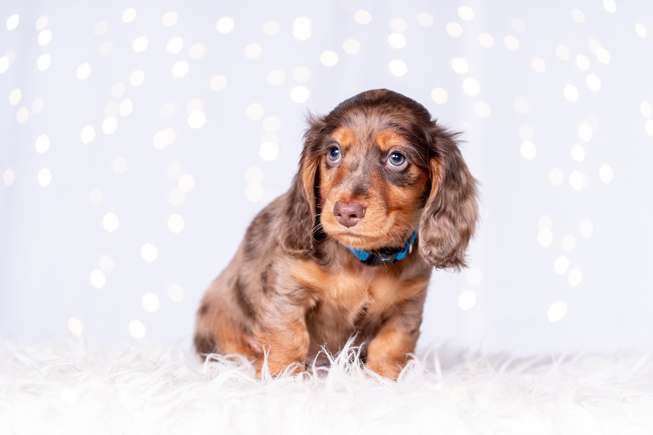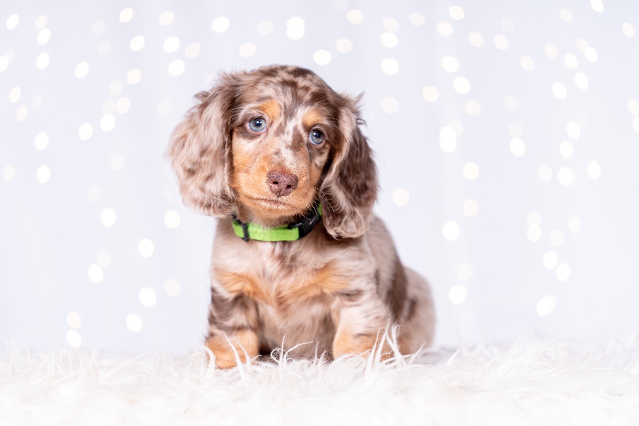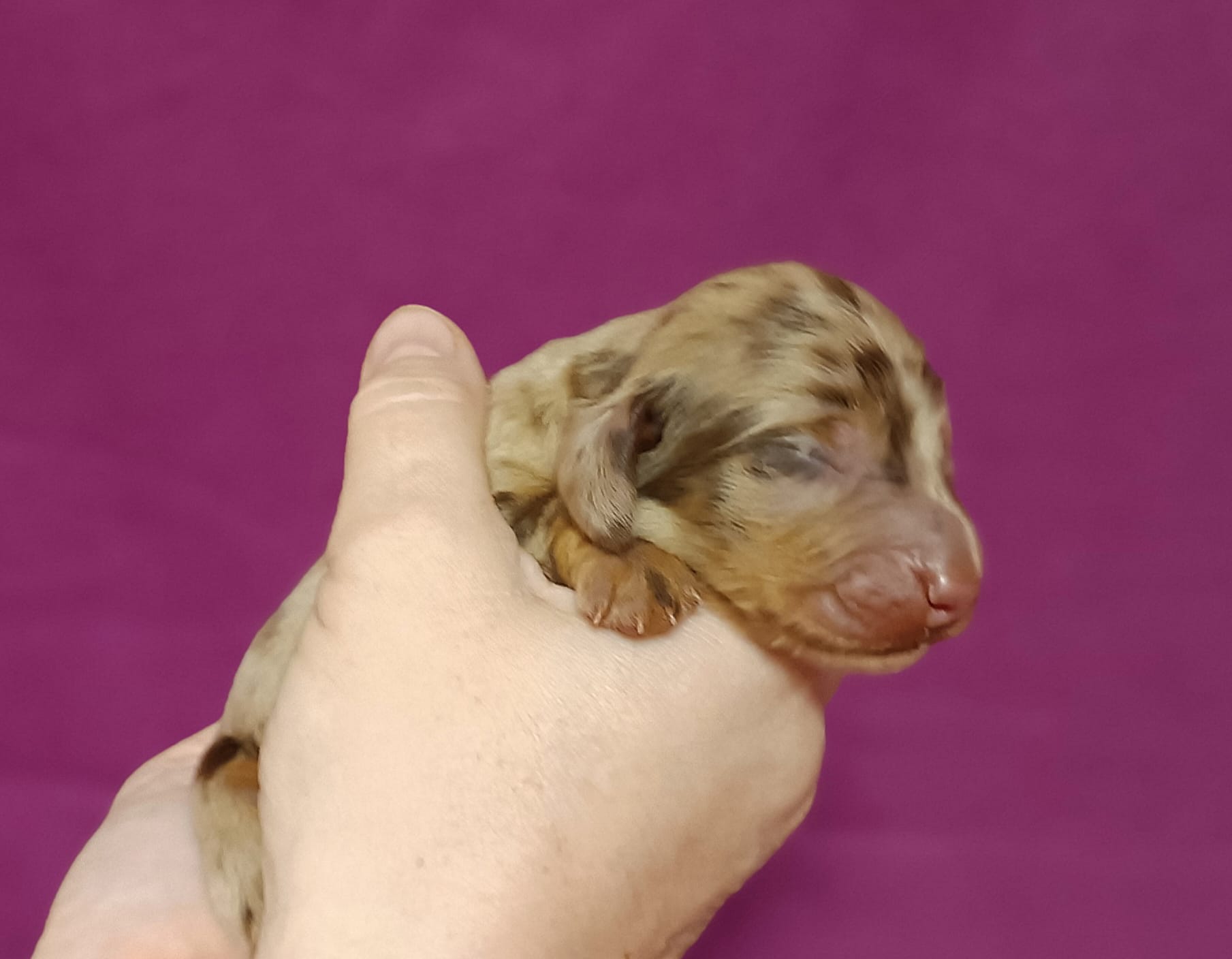 v 7,35 hod. je to pejsek ve zbarvení hnědá s pálením merle, vážíl 234g.